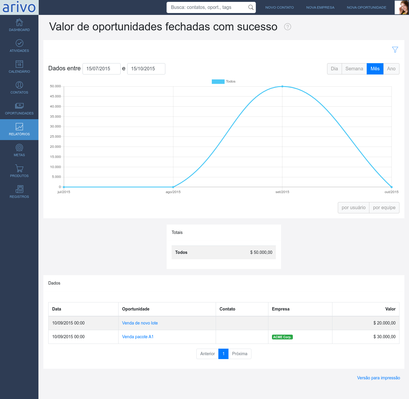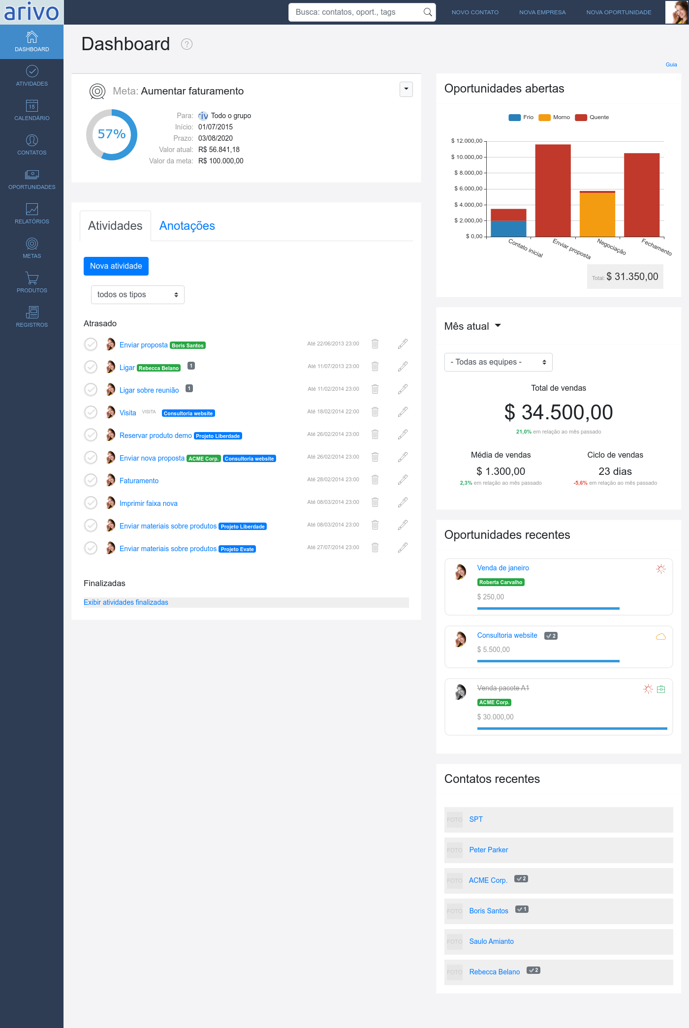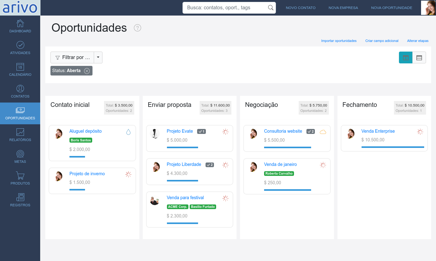Relatórios para visualizar como andam suas oportunidades, contatos e atividades. Analise e descubra onde sua equipe ou seu processo pode melhorar.